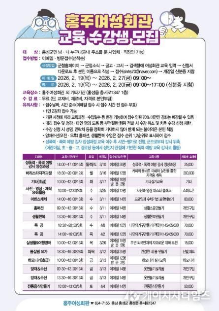 (케이시사타임즈) 홍성군 홍주여성회관이 군민들의 자격 취득과 창업을 돕는 ‘2026년 상반기 교육과정’ 수강생을 모집한다.