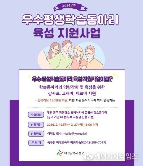 (케이시사타임즈) 대전 동구는 학습공동체 활성화를 위해 ‘2026년 우수 평생학습동아리 육성 지원사업’ 신청을 19일부터 오는 27일까지 접수한다고 밝혔다.