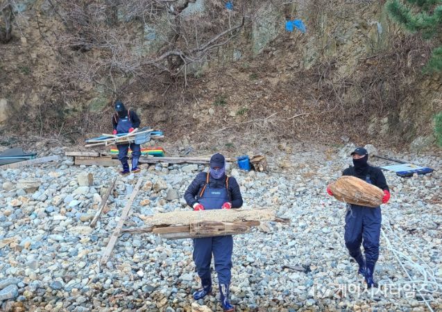 (케이시사타임즈) 울산 동구는 2월 20일 오전 대왕암공원 출렁다리 밑 해안 일대에서 해양쓰레기를 수거하는 해안 정비 활동을 했다.