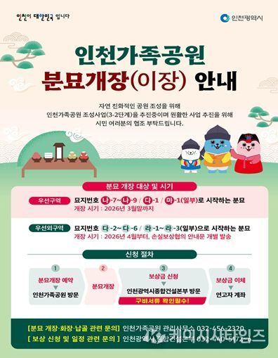 (케이시사타임즈) 인천광역시 종합건설본부는 인천가족공원을 시민들의 쾌적한 휴식공간으로 탈바꿈하기 위한 ‘인천가족공원 조성사업(3-2단계)’의 분묘 보상 및 개정절차를 본격적으로 시행한다고 밝혔다.