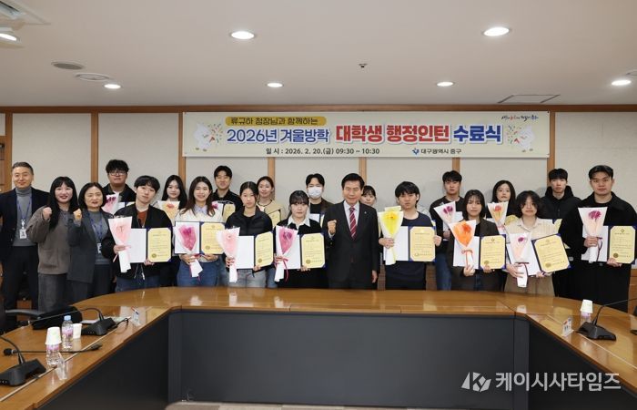 (케이시사타임즈) 대구 중구는 지난 20일 구청 상황실에서 ‘2026년 겨울방학 대학생 행정인턴 수료식’을 개최했다.