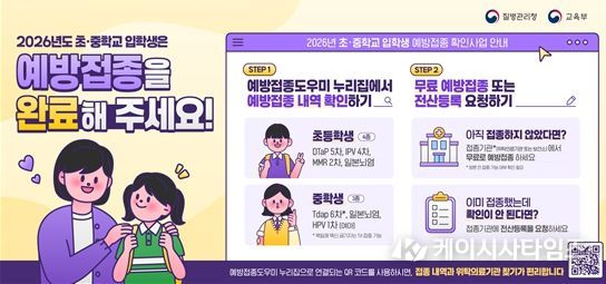 올해 초·중학교 입학생을 둔 보호자는 질병관리청 예방접종도우미 누리집에서 자녀의 접종 내역을 확인하고 접종을 완료하지 않은 경우 가까운 위탁의료기관을 방문하면 무료로 접종받을 수 있다.