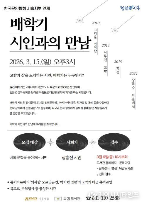 이번 만남은 3월 15일 오후 3시, 목감도서관 지하 1층 다목적실에서 진행되며, 시와 문학에 관심이 있는 50여 명의 시민과 함께한다. 시인이 직접 자신의 작품을 낭독하고, 시를 쓰게 된 계기와 창작 과정에 관한 이야기를 들려줄 예정이다. 또한, 시민들과 자유롭게 질문을 나누며 시와 삶에 대해 편안하게 대화하는 시간도 마련된다.