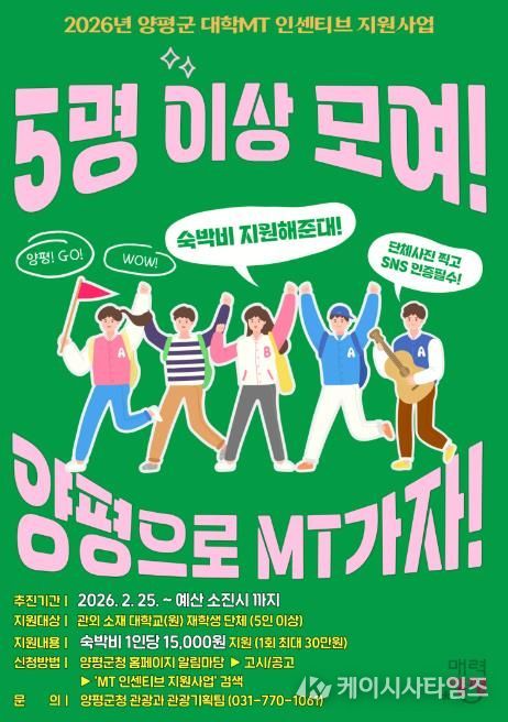 (케이시사타임즈) 양평군은 25일부터 관외 대학생들의 지역 방문을 유도하고 관광 활성화를 도모하기 위해 ‘2026년 양평군 대학 엠티(MT) 인센티브 지원 사업’을 본격 시행한다고 밝혔다.