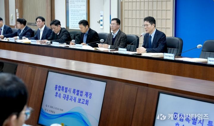 (케이시사타임즈) 전라남도는 25일 도청 서재필실에서 황기연 행정부지사 주재로 전남광주통합특별시 특별법 후속 대응과제 보고회를 열고, 7월 출범을 앞둔 통합특별시의 안정적 출범을 위한 213개 핵심 과제를 점검했다.