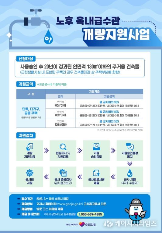 (케이시사타임즈) 거제시는 깨끗하고 안정적인 수돗물 공급을 위해 “노후 옥내급수관 개량지원사업”을 시행한다고 밝혔다.