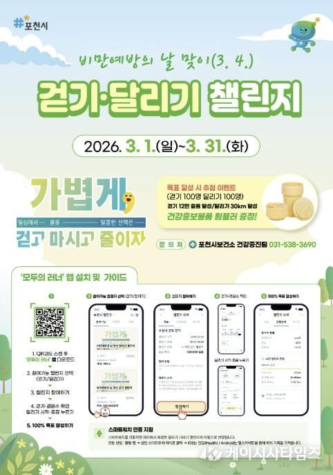 (케이시사타임즈) 포천시는 오는 3월 4일 ‘비만예방의 날’을 맞아 '비만예방의 날 맞이 걷기·달리기 챌린지 및 합동캠페인'을 3월 한 달간 운영한다.