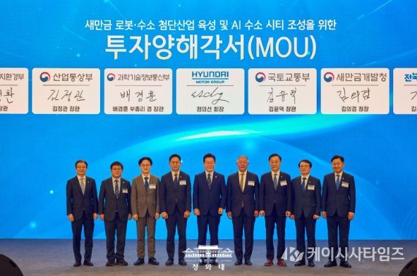 (케이시사타임즈) 이재명 대통령은 27일 새만금 로봇·수소·AI 시티 투자 협약식에 참석해 "현대자동차그룹의 혁신 역량 그리고 풍부한 자원이 합쳐진다면 새만금은 최적의 시너지를 발휘하는 기회의 땅이 될 수 있을 것으로 믿는다"고 밝혔다.