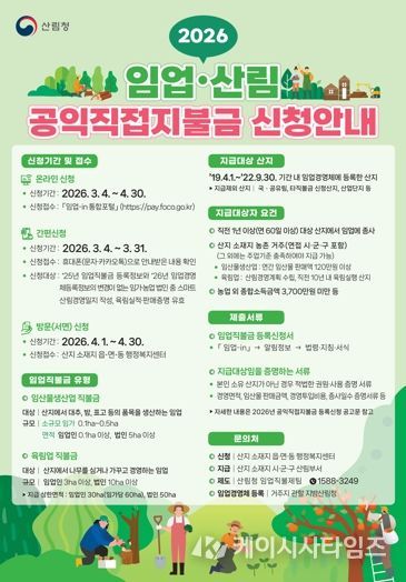 (케이시사타임즈) 경상북도는 농업인의 소득 안정을 지원하고, 농업·농촌의 공익적 기능을 강화하기 위해 2026년도 기본형 공익직불금 신청을 3월 1일부터 5월 31일까지 접수한다고 밝혔다.