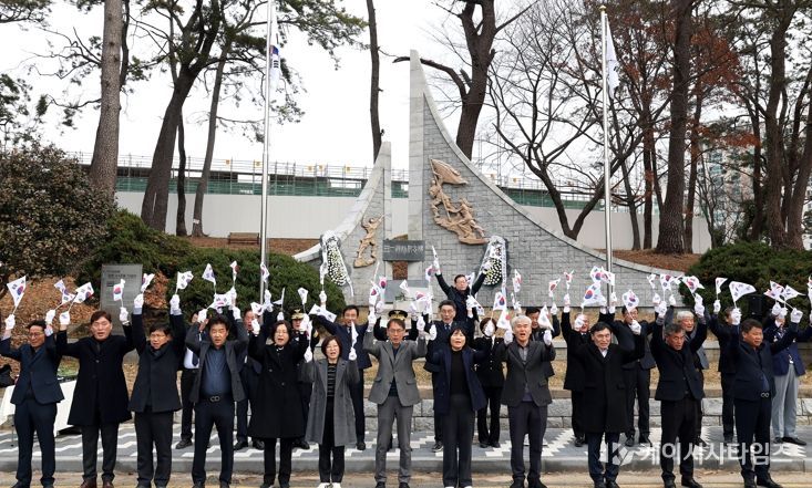 (케이시사타임즈) 1일 잃어버린 조국을 되찾기 위해 외쳤던 3.1 독립만세운동이 107주년을 맞이한 가운데 1976년 건립된 강진군 강진읍 서성리 3.1운동 기념비 앞에서 김준철 강진 부군수를 비롯해 각급 기관단체장 등 참석자들이 기념식을 갖고 대한독립 만세를 외치고 있다.