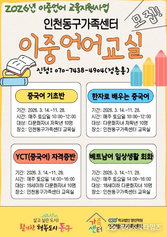 (케이시사타임즈) 인천동구가족센터는 다문화가족 및 외국인 가정 자녀를 대상으로 가정 내 이중언어 환경 조성을 장려하여 글로벌 인재 양성에 앞장설 계획이라고 밝혔다.
