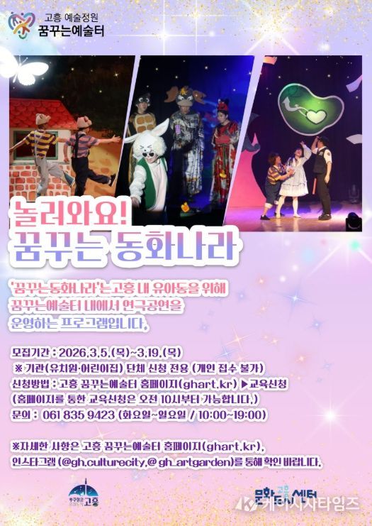 (케이시사타임즈) 고흥군은 오는 3월 5일부터 19일까지 어린이 연극 ‘놀러와요 '꿈꾸는 동화나라'’공연을 관람할 관내 유치원과 어린이집 등 단체를 모집한다고 밝혔다.