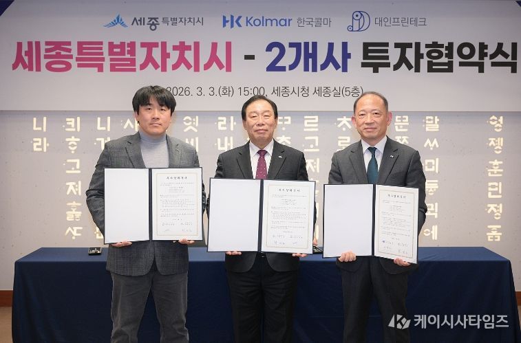(케이시사타임즈) 세종특별자치시가 3일 시청 세종실에서 한국콜마㈜, ㈜대인프린테크와 관내 산업단지 내 공장 신설 및 전면 이전을 위한 1,858억 원 규모의 투자협약(MOU)을 체결했다.