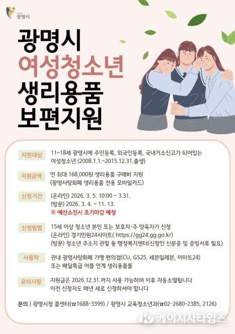 (케이시사타임즈) 광명시가 4일부터 청소년의 건강권과 인권 보장을 위해 ‘여성청소년 생리용품 보편지원 사업’ 신청을 받는다.