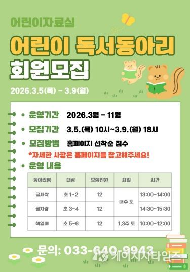 (케이시사타임즈) 강릉교육문화관은 초등학생들을 대상으로 3월 14일부터 2026년 어린이 독서동아리를 운영한다.