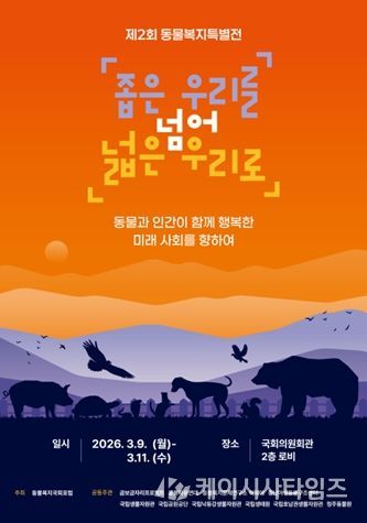 (케이시사타임즈) 기후에너지환경부 산하 국립호남권생물자원관은 국내 동물이 겪는 실태를 알리고 선진 동물복지 사회로의 발전 필요성을 공유하고자 여러 기관과 협력해 동물복지특별전 ‘좁은 우리를 넘어 넓은 우리로’를 3월 9일부터 11일까지 국회의원회관 2층 로비에서 개최한다.