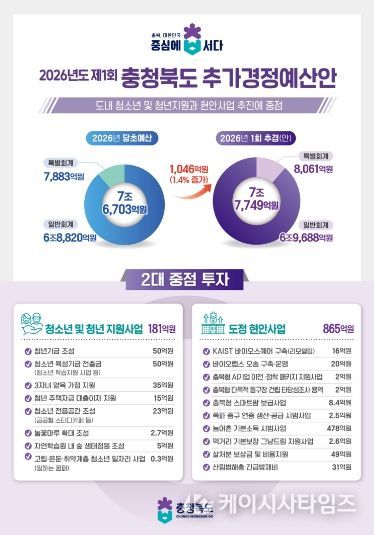 (케이시사타임즈) 충북도는 도민 체감형 위주의 사업 지원 및 상반기 추진이 시급한 역점사업 추진을 위해 1,046억원 규모의 제1회 추가경정예산안을 3월 3일 충청북도의회에 제출했다.