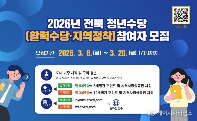 (케이시사타임즈) 김제시는 관내 미취업 청년의 구직활동을 지원하고 경제적 부담을 완화하기 위해 '2026년 전북형 청년활력수당' 참여자 75명을 모집한다고 밝혔다.