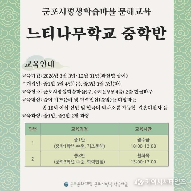 (케이시사타임즈) 군포문화재단 군포시평생학습마을은 지난 3일 성인 문해교육 프로그램 ‘느티나무학교’를 개강했다고 밝혔다.