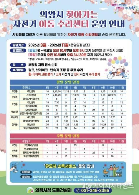 (케이시사타임즈) 의왕시가 시민들의 자전거 이용 활성화와 안전한 자전거 문화 확산을 위해 '2026년 찾아가는 자전거 이동 수리센터'를 운영한다.