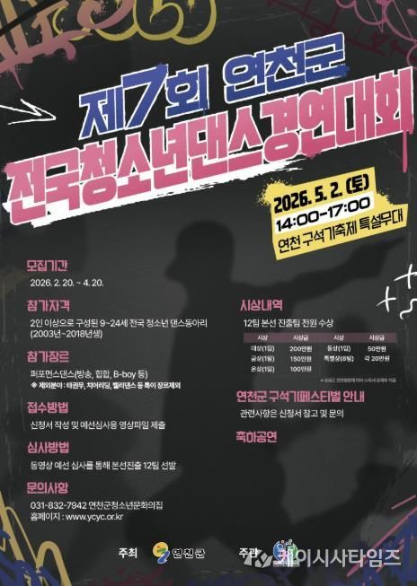 (케이시사타임즈) (재)연천군청소년육성재단(청소년문화의집)은 전국 청소년들이 꿈과 열정을 마음껏 펼칠 수 있는 무대를 마련하고, 창의적인 문화예술 활동을 확산하기 위해 제7회 연천군 전국청소년댄스경연대회를 개최한다고 밝혔다.