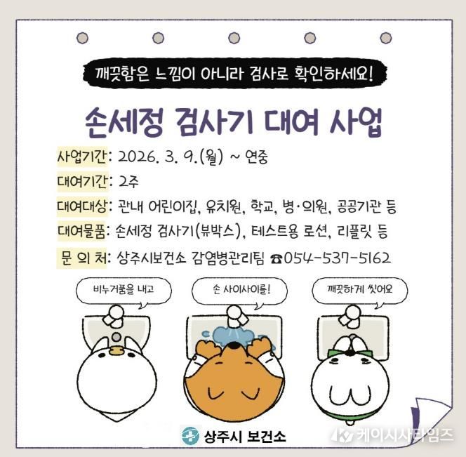 (케이시사타임즈) 상주시보건소는 지역 어린이집, 유치원, 학교, 공공기관 등을 대상으로 올바른 손씻기 습관 형성과 감염병 예방을 위한 ‘손세정 검사기 대여 서비스’를 3월부터 연중 운영한다고 밝혔다.