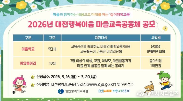 (케이시사타임즈) 대전시교육청은 마을과 학교가 협력하는 교육생태계 조성을 위해 ‘2026년 마을교육공동체 마을학교 및 씨앗동아리’를 공모한다고 밝혔다.