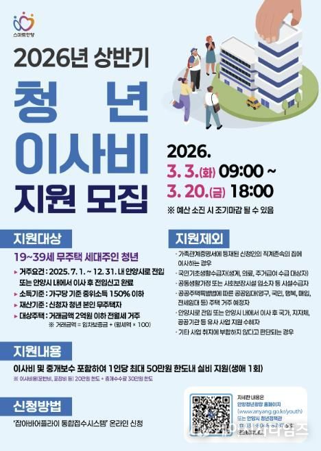 시는 2025년 7월 1일부터 12월 31일 내 안양시로 전입하거나 안양시 내에서 이사한 후 전입신고를 완료한 19세 이상 39세 이하의 청년 가구에게 1인당 최대 50만원 한도 내에서 이사비 및 중개보수비를 지원한다.