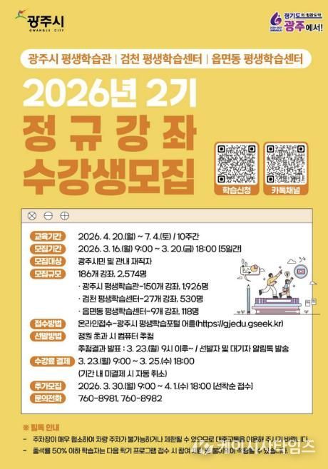 (케이시사타임즈) 광주시는 오는 16일부터 20일까지 2026년 제2기 평생학습 프로그램 수강생을 모집한다고 6일 밝혔다.