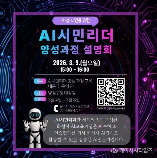 (케이시사타임즈) 화성특례시는 시민이 학습하고 교육하는 인공지능(AI) 학습 체계 구축을 위해 ‘2026년 AI시민리더 양성 교육’ 설명회를 3월 9일 오후 3시에 병점구청 대강당에서 개최한다.
