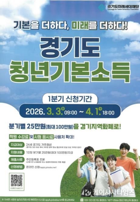 (케이시사타임즈) 오산시는 24세 청년에게 분기별 25만 원을 지급하는 ‘청년기본소득’ 2026년 1분기 신청을 3월 3일부터 4월 1일까지 접수한다고 밝혔다.