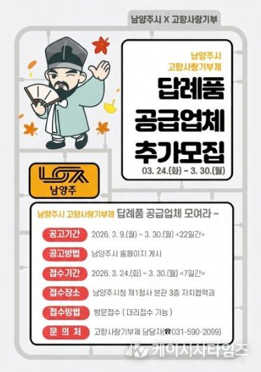 (케이시사타임즈) 남양주시는 오는 3월 24일부터 고향사랑기부제 참여자들에게 제공할 ‘2026년 고향사랑기부제 답례품 공급업체’ 추가 모집 접수를 시작한다고 6일 밝혔다.