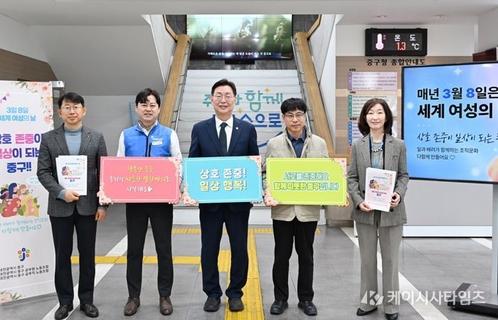 (케이시사타임즈) 대전 중구는 ‘3.8 세계 여성의 날’을 앞두고 지난 6일 구청 본관 로비에서 노사가 함께 출근하는 직원들을 격려하며 ‘좋은 직장, 서로 존중 캠페인’을 전개했다고 밝혔다.
