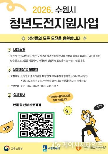 (케이시사타임즈) 수원시청소년청년재단 수원시청년지원센터는 취업 준비 과정에서 어려움을 겪고 있는 청년을 대상으로 ‘2026 수원시 청년도전지원사업’ 참여자 130명을 모집한다고 6일 밝혔다.