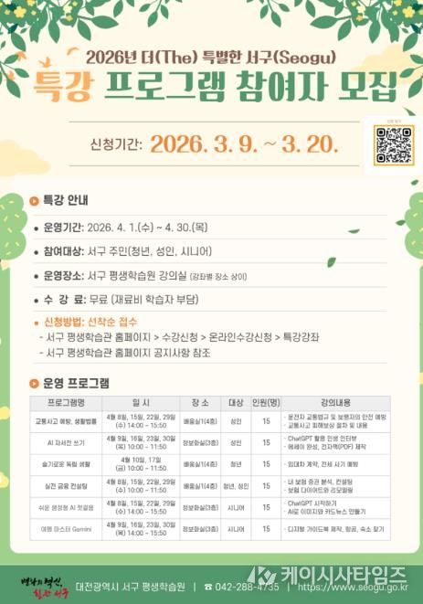 (케이시사타임즈) 대전 서구 평생학습원은 ‘2026년 봄학기 더(The) 특별한 서구(seogu)’특강 참여자를 모집한다고 9일 밝혔다.