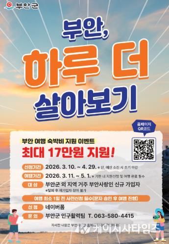 (케이시사타임즈) 부안군은 관광객 체류시간 확대와 지역 상권 활성화를 위해 ‘부안, 하루 더 살아보기’ 이벤트를 추진한다고 밝혔다.