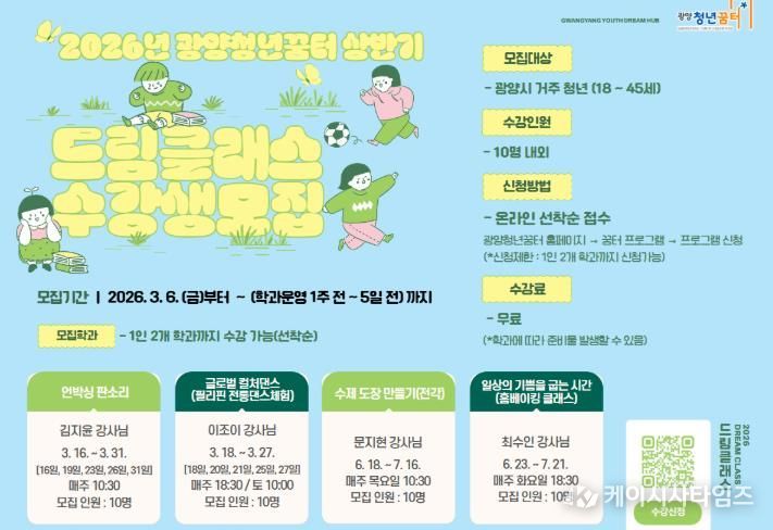 (케이시사타임즈) 광양청년꿈터는 지역 청년이 직접 기획하고 운영하는 청년 주도형 학습 프로그램 ‘2026년 상반기 드림클래스’ 수강생을 모집한다고 밝혔다.