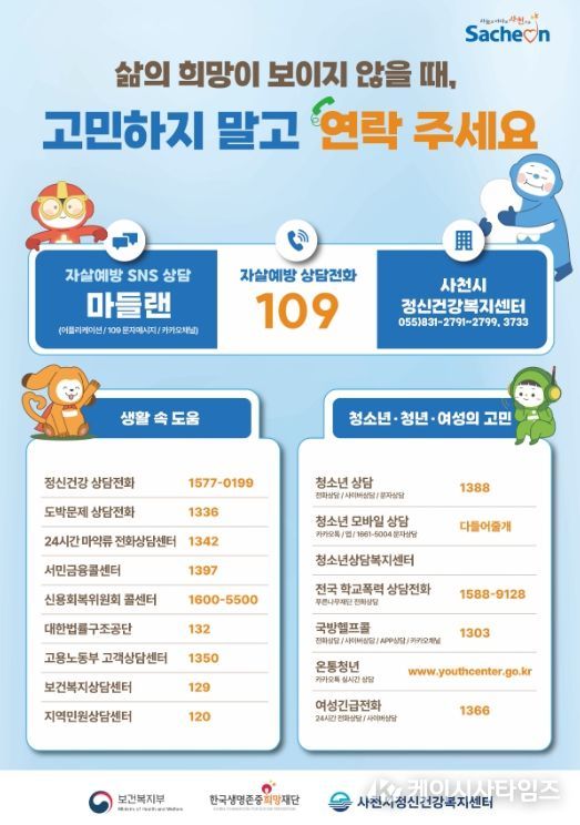 사천시보건소 문지연 소장은 “봄은 새로운 시작의 계절이지만, 누군가에게는 가장 외롭고 힘든 시간이 될 수 있다.”며, “사천시는 시민 한 분 한 분의 생명을 지키기 위해 촘촘한 안전망을 구축하고 있으며, 어려움을 겪고 있다면 혼자 고민하지 말고, 반드시 도움을 요청해 달라.”고 말했다.