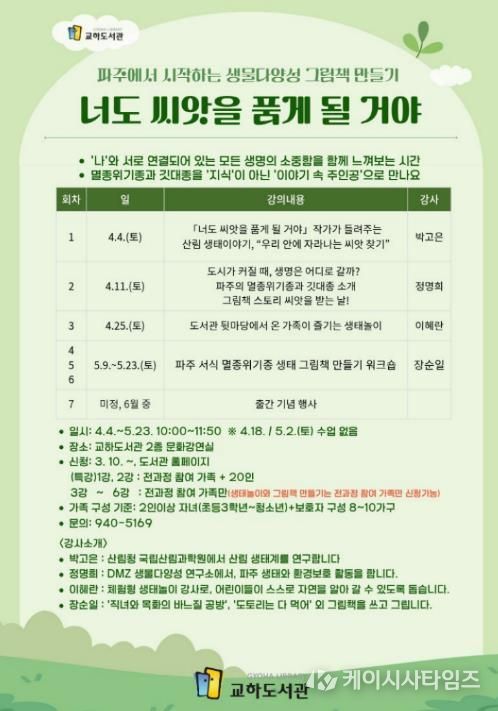 (케이시사타임즈) 파주시 교하도서관 오는 4월 4일부터 5월 23일까지 가족 참여형 지역연계 프로그램 ‘너도 씨앗을 품게 될 거야’를 매주 토요일 10시부터 11시 50분까지 교하도서관 2층 문화강연실에서 운영한다.
