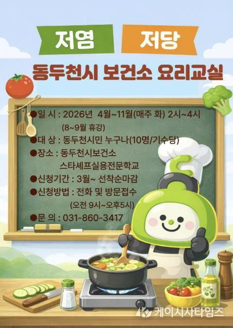 (케이시사타임즈) 동두천시보건소는 2026년 만성질환 관리 및 예방을 위한 ‘저염·저당 식단 요리 프로그램’ 참여자 60명(매월 10명씩)을 선착순 모집한다고 밝혔다.