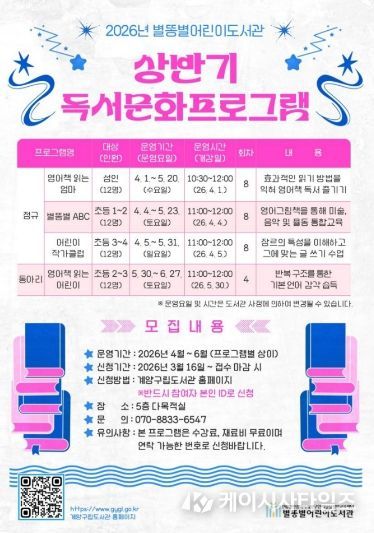 (케이시사타임즈) (재)인천광역시계양구인재양성교육재단 별똥별어린이도서관은 지역주민을 대상으로 2026년 상반기 독서문화프로그램을 운영한다.
