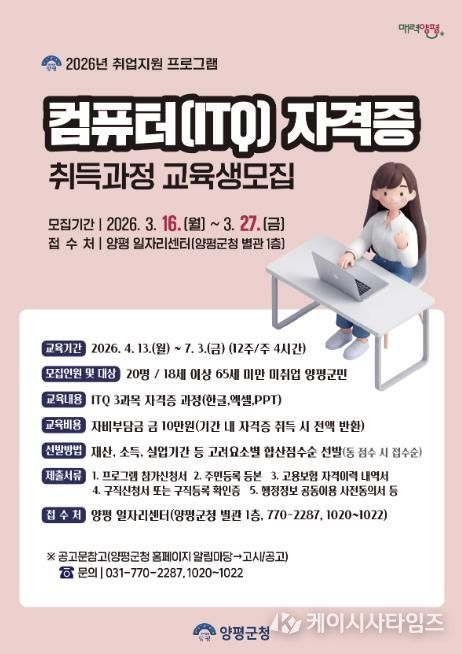 (케이시사타임즈) 양평군은 오는 16일부터 디지털 기반 업무 환경에 대응할 수 있는 실무형 인재 양성과 지역 일자리 창출을 위해 2026년 취업지원 프로그램 ‘컴퓨터(ITQ) 자격증 취득과정’ 교육생을 모집한다.