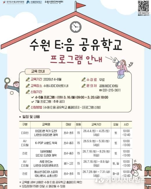수원시미디어센터는 ‘2026년 수원 E:음 공유학교’ 지역맞춤형 기관 연계 프로그램 운영 기관으로 선정되어, 오는 4월부터 디자인, 사운드, 스피치 등 다채로운 미디어 교육을 본격 가동한다.