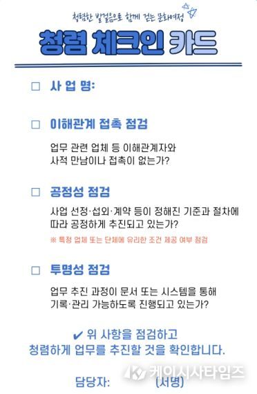 체크인 카드에는 ▲이해관계자와의 사적 접촉 여부 ▲사업 추진 과정의 공정성 ▲부당청탁 발생 여부 ▲업무 추진 과정의 기록 및 관리 가능 여부 등 업무 추진 시 점검해야 할 청렴 항목이 포함돼 있으며, 담당자가 업무 시작 단계에서 간단히 확인하도록 구성됐다. 특히 문화관광 분야는 민간단체 및 업체와의 협업이 많은 만큼, 이번 시책을 통해 업무 초기 단계에서 청렴 위험 요소를 점검함으로써 부패 발생 가능성을 사전에 예방하는 데 목적이 있다.