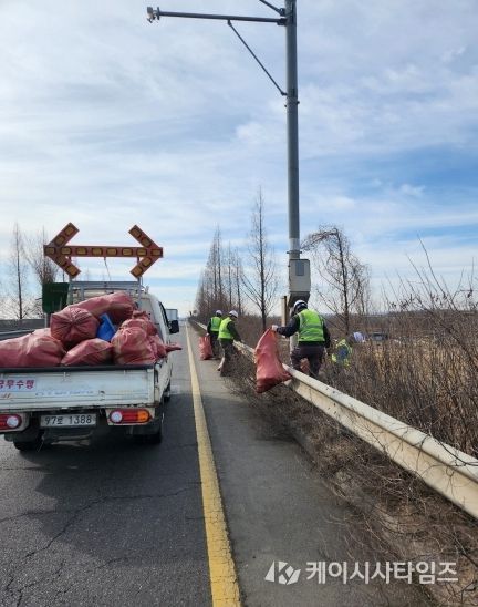 시는 지난 2월 26일 시작하여 3월 15일까지 관내 주요 국도 구간을 대상으로 환경 정비를 실시 중이며, 현재 교차로 및 비탈면 등에서 생활 쓰레기와 불법 투기 폐기물 등 1톤 마대 80여 개 분량의 폐기물을 수거하는 등 국도변 청소 작업을 하고 있다.