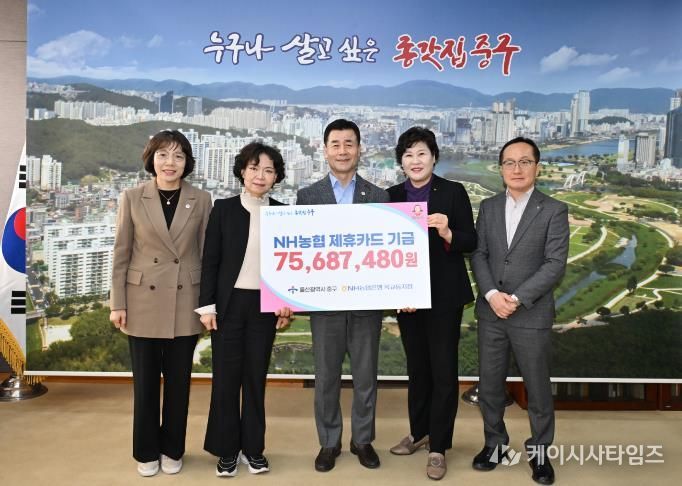 (케이시사타임즈) NH농협은행 옥교동지점이 3월 12일 오전 10시 30분 중구청 구청장실을 방문해 제휴카드 발전 기금 7,568만 원을 전달했다.