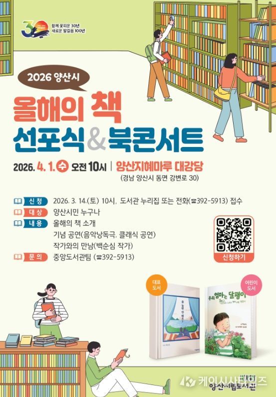 (케이시사타임즈) 양산시립도서관은 오는 4월 1일 수요일 오전 10시, 지혜마루 대강당에서‘2026년 올해의 책 선포식 및 북콘서트’를 개최한다.