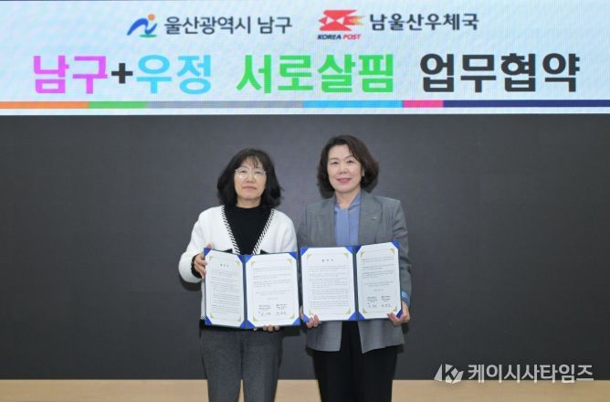 (케이시사타임즈) 울산 남구는 12일 구청 3층 소회의실에서 사회적 고립과 위기가구 증가에 대응하고 고독사를 예방하기 위해 남울산우체국과 ‘남구+우정 서로살핌’ 업무협약을 체결했다.