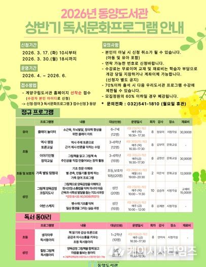수강 신청 기간은 3월 17일 오전 10시부터 3월 30일 오후 6시까지이며, 계양구립도서관 누리집을 통해 선착순으로 접수한다. 보다 자세한 사항은 누리집 내 독서문화프로그램 안내를 참고하거나, 동양도서관 아동자료실로 문의하면 된다.