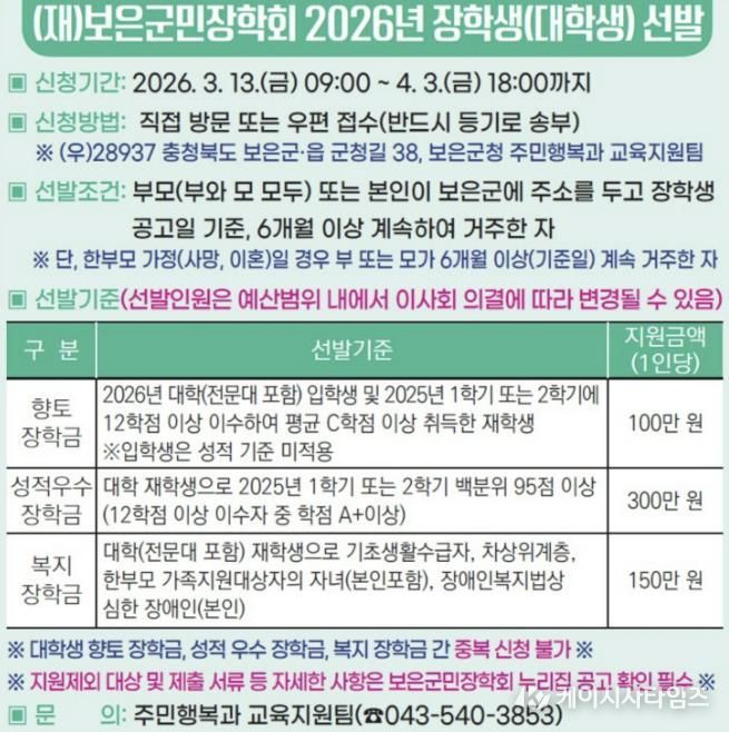 (케이시사타임즈) 재단법인 보은군민장학회는 지역 인재 육성과 교육 지원을 위해 2026년 대학생 장학생을 4월 3일까지 모집한다고 16일 밝혔다.